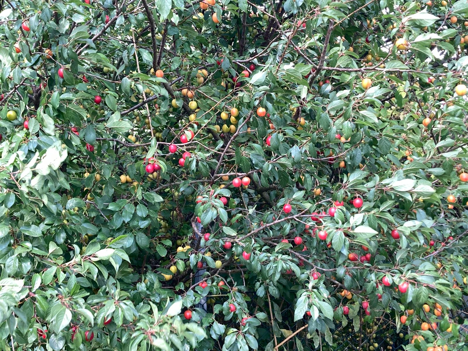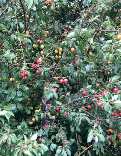 Die Wildobstecke befindet sich auf einem schlechten Standort und hat es sehr schwer, sich gegen die immer wieder austreibenden Brombeeren durchzusetzen. Umsiedeln ist aufgrund der Größe der Bäume nun keine Option mehr. Bleibt zu hoffen, dass sich die Aronien und Ebereschen in den nächsten Jahren noch etablieren können. Die 3 Apfelbäume und die Gojibeere stehen schon ganz gut da. Direkt anschließend befindet sich das Hühnergehege, wo die Kirschpflaumen und Haselnusssträucher mittlerweile ein geschlossenes Blätterdach bilden und sich die Hühner hoffentlich vor dem Habicht verstecken können.